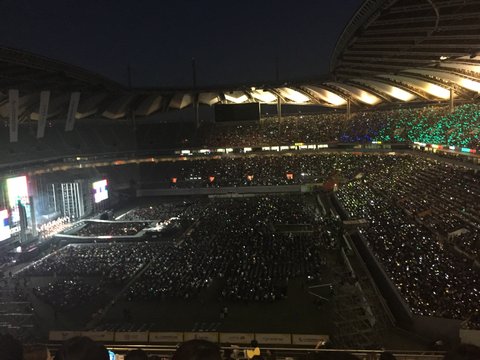 확실히 엑소팬덤 규모가 장난 아니더라구요 하얀색 불빛이 월드컵경기장 절반이상이었고 함성소리도 제일 컸어요