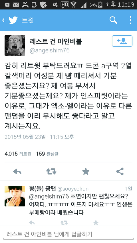 ㅋㅋ 며칠전에 드림콘서트가 있었는데 그 때 인스피릿이랑 엑소엘 사이에서 팬석을 두고 마찰이 있었음. 근데 알다시피