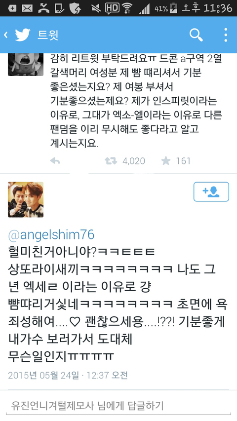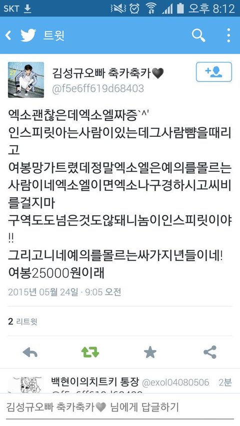 이런글이 올라옴. 보다시피 현재 리트윗수 장난아님^^ 이게 인스피릿 뿐만 아니라 그 당시에 다른 팬덤들까지 이 글을 믿고 리트윗하면서 엑소엘 욕 장난아니게 먹음.