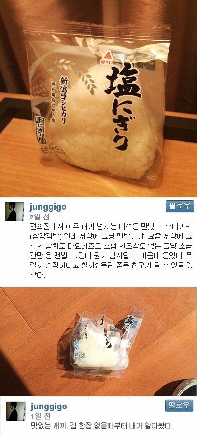삼각김밥으로 유명해진 정기고 인스타ㅋㅋㅋㅋㅋㅋㅋㅋ