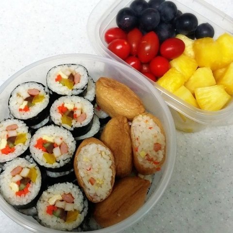 이 정도면 뭐 한 1시간이면 뚝딱 해낼 수 있죠ㅋㅋㅋ 김밥, 유부초밥, 그리고 과일들^^