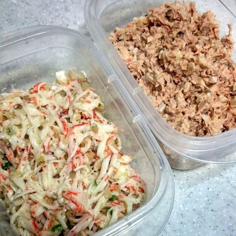각각 다른 그릇에 크래미와 참치를 담고 다진 양파, 다진 피클, 설탕, 마요네즈를 넣고 섞어주세요.