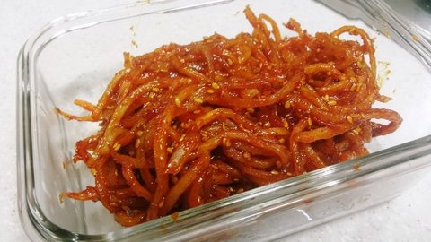오이도 채썰고 김치도 잘게썰어서 설탕이랑 참기름에 조물조물 무치고