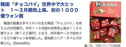 일본 검색사이트 뉴스에 한국 초코파이가 세계에서 대히트해서 올해1-3월 매출만 1000억원이상의 매출을 냇다는 뉴스가 올라옴.