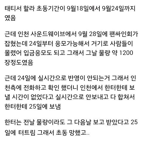 한터에서 팬싸 물량이 한꺼번에 잡히는 경우는 흔한데이게 말도 안된다는 애들은 한터차트에 대해서 잘 모르는 거다.팬싸물량은 심지어 저렇게 당일도 아닌 다음날 터지는 경우도 있음.