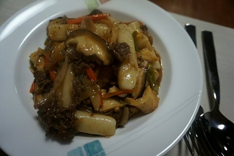 양념된 소불고기 얼린거... 해동시키고.. 거기에 야채랑 떡넣고 볶음 되요 ㅎㅎ