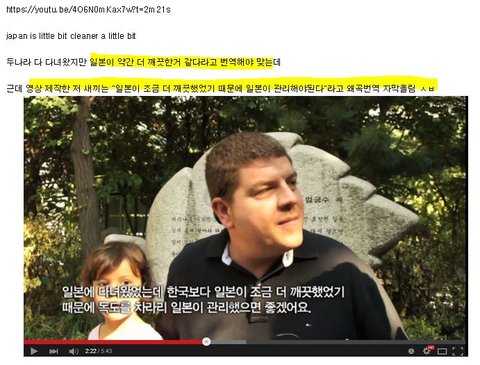 이거 영상 제작한 사람이 일부러 왜곡 번역했음 ------------------------------------------------------------ 두나라 다 다녀왔지만 일본이 약간 더 깨끗한거 같다라고 번역해야 맞는데 근데 영상 제작한 사람은 "일본이 조금 더 깨끗했었기 때문에 일본이 관리해야된다"라고 왜곡번역 자막올림 유흥거리라 유난히 지저분한 홍대에서 촬영한것도 의심스러운데 자막조작까지 했네요 [펌글] ----------------------------------------------------------------