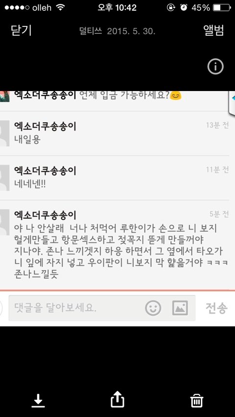 이거 동ㅅ이ㅁ 걔 한ㅅㅈ맞음? 친구가 맞다면서 자기 아는 언니가 보내준거라고하는데 카ㅅ라 안 믿기기는 하는데 충격임