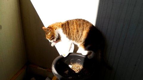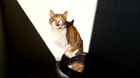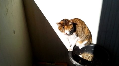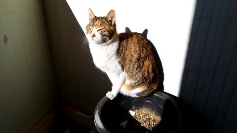많이 추웠던지 햇볕이 비취는 화분 모서리에 올라가서 위태로운 자세로 입주위를 열심히 닦는 그루밍을 하는 길고양이 람쥐입니다.ㅠㅠ