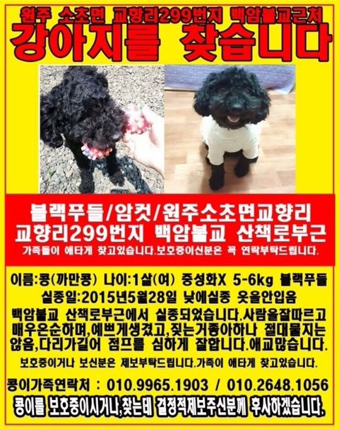 특징 얼굴이 이쁘고 털이 까맣고 눈도 되게 크고 코도 이쁘고 입도 이쁘고 너무 사랑스러운 강아지입니다 사람을 정말 좋아합니다 점프도 잘하구요 어떤 먹는 것만 보면 좋아서기절합니다 달리는 것도 잘합니다 다리도 길구요 처음 사진이 최근사진입니다 저는 경기도에 사는데 아빠네 화실이 원주라서 며칠동안 맡겨놨었는데 아빠가 다른 곳에 잠깐 일보러 나가신동안에 아빠 손님이 화실에 아무도 없고 콩이만 있을 때 문을 열었는데 콩이가 뛰쳐나갔다고 합니다 원주 쪽에 사시는 분들께 널리 퍼트려주세요 부탁드립니다 원주쪽 사는 분들은 공유 좀 해주세요 부탁드려요 사례는 꼭 해드릴거구요 저 정말 콩이 없으면 안돼요 좀전에 지나가던 학생이 말해줬는데 백암불교에서 좀내려가다보면 슈퍼가하나있는데 교항리 구령사 근처 치악슈퍼 쪽에서 검정색 스포티지 차량을 타고 어떤 아저씨가 강아지를 태워서 갔다네요 차 안에는 초등학생 두명이 타고있었답니다 키울실 생각으로 데리고 가신 것 같네요 차량을 탄사람이라서 확실히 원주사람인지 아닌지도 모르겠어요 사례해드릴게요 제발 연락좀주세요 부탁드려요 제발 찾아주세요 정말 부탁드립니다 정말요 비슷한 강아지라도 보시면 꼭 연락주세요 부탁드려요 진짜 너무 힘듭니다