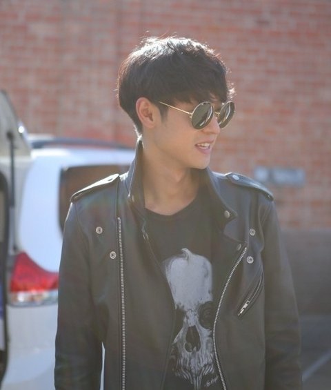 이날 더쿠플스 해골 티셔츠 위에 가죽 자켓 걸치고