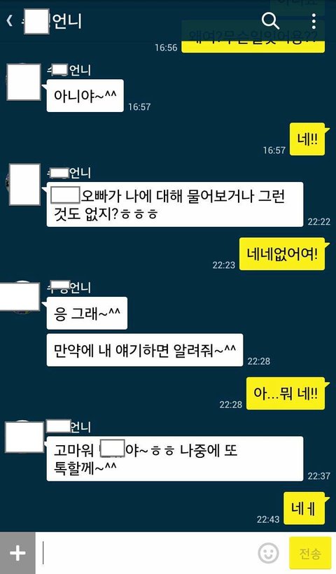 한번은 오빠여친이 나만나보고싶다고해서 셋이서 밥을먹으러갓는데 쫌 놀ㄹ랏어우리오빠한테 먼저대쉬해서 사귀자그랫다는데 엄청 세보이고 옷입은것두약간 야하게입구 화장도 세게하고와서 흠칫햇는데 생글생글웃고그래서 좋은 언닌가보다~햇어ㅜㅜㅠ근데저저번주에 내 카톡에친추가된거야... 번호도없는데... 오빠한테물어보니까 나랑 연락하면서 지내고 싶다고 번호를 받아간거야 그때만해도 그런가보다그랫어이상하다싶은게 저번주토욜에 갑자기 톡이오더니만