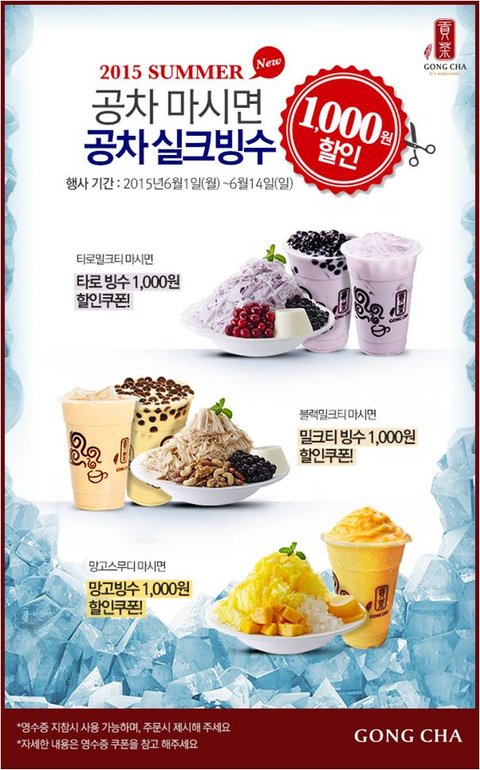 공차 실크 빙수 출시해서 할인 이벤트 중입니다.티나 스무디를 드시면 해당되는 실크빙수를 1,000원 할인해준다고 하네요실크빙수 맛있다고 난리났던데,얼른 매장 가보세요,