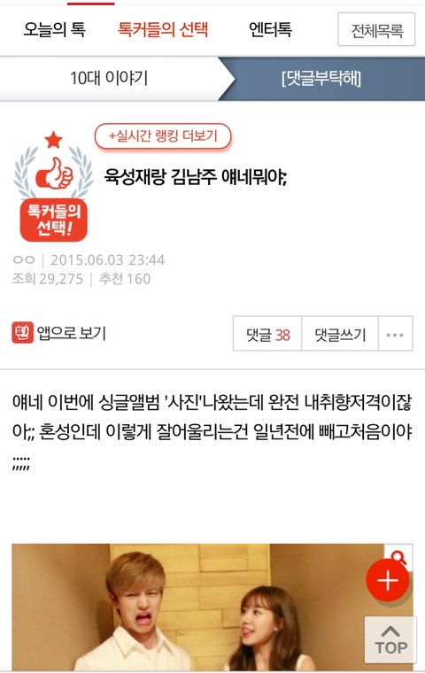 -+톡선에 올랐네!!!!당황당황 고마워ㅠㅠㅠ이번 사진 노래진짜 인생노래수준이니까 꼭 들어보고 성재X남주 케미쩐다ㄷㄷㄷ 아그리고 조이♡성재 잘 촬영하고!!다 잘되길♡ 참고로 쓰니는 남주여덕!핑덕은 아니고 그냥 제일좋아하는 여돌이 김남주!육성재도 좋다 사진또들으러가야징헤페페펲