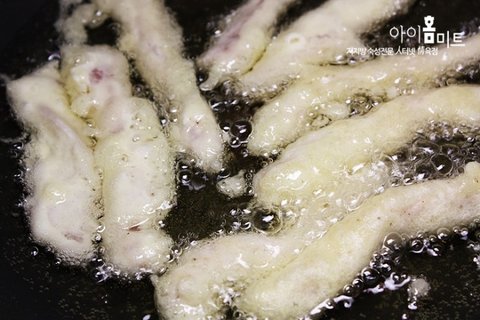5.준비한 팬을 달구고 덧가루를 묻힌 고기를 얼음 넣은 반죽물에 묻혀 튀겨준다.