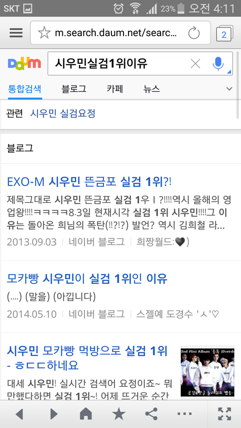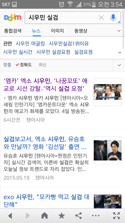 밑에 웅녀가 말한 랭킹뉴스 보려고 (클릭이 안됨) "시우민 실검"을 검색했더니.. 연관 검색어가 "시우민 실검 1위 이유" 라고 나오는거야.