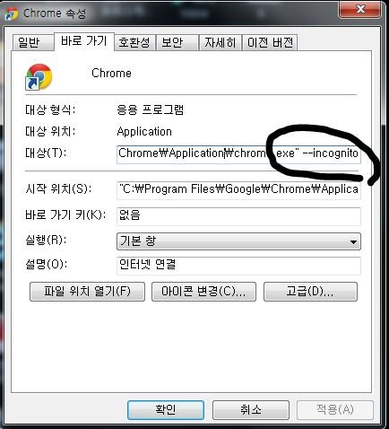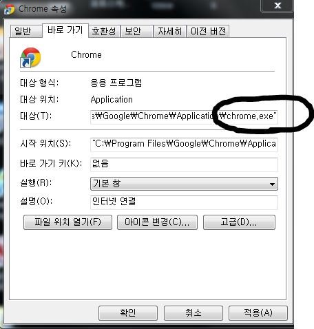 크롬 아이콘 오른쪽마우스로 클릭해서 1. 맨밑에 속성누르기(또는 R 누르기)