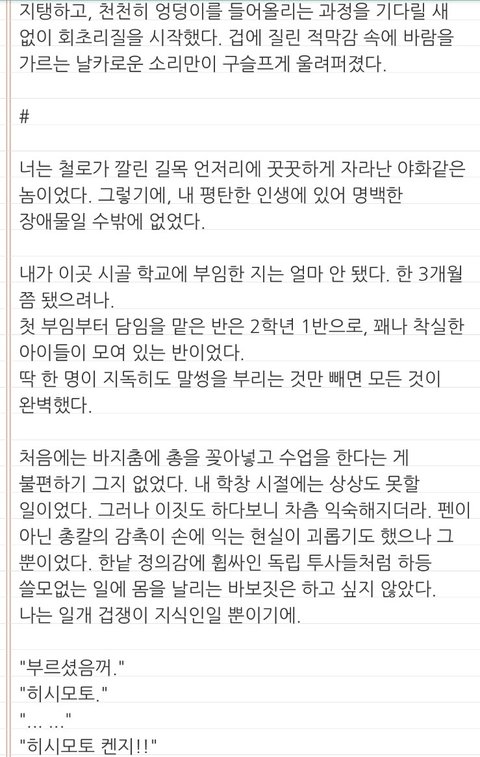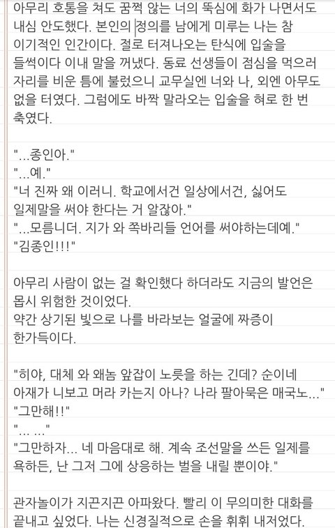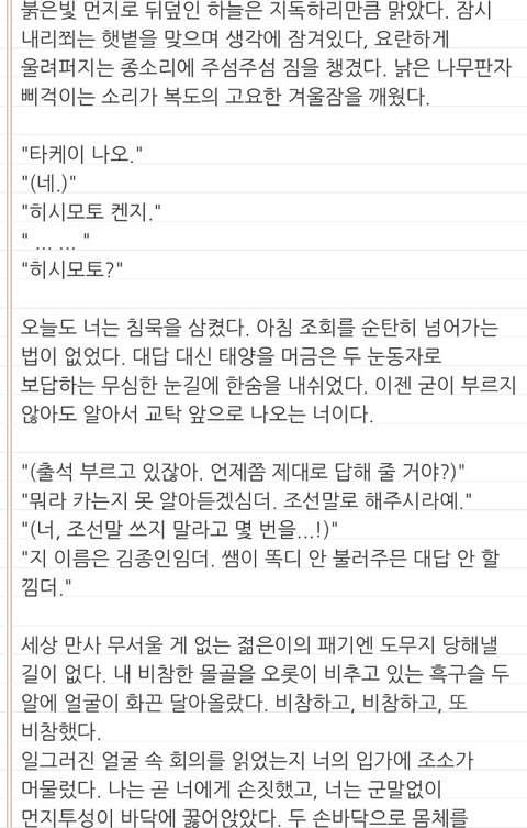 추가하자면 배경은 일제강점기고, 수는 고딩 때 일본인 후원자의 도움으로 고향을 떠나 일본에서 죽어라 공부해 성공한 케이스야.(머리가 좋음) 대학 졸업 후 고향에 돌아와 선생님을 하는거구(거의 좌천급), 공은 어렸을 때 수랑 친하게 지내던 동네 꼬맹이임.