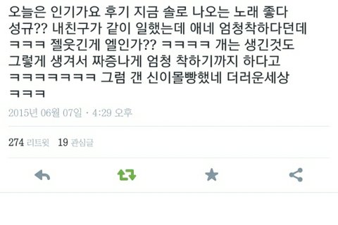 난 별빛인데 트위터하거나 인스티즈 판하다 보면 타가수 사진들도 많이 보게 되잖아ㅋㅋㅋㅋㅋㅋ근데 와...엘 보고 진짜 감탄함ㅋㅋㅋㅋㅋㅋ사람이 어떻게 저렇게 생겼지ㅋㅋㅋㅋㅋㅋㅋㅋ콩깍지 땜에 홍빈이가 세젤잘이라고 생각했는데 진짜 타가수보고 감탄한건 최강창민말고 엘이 처음이야ㅇㅅㅇ...
