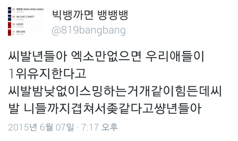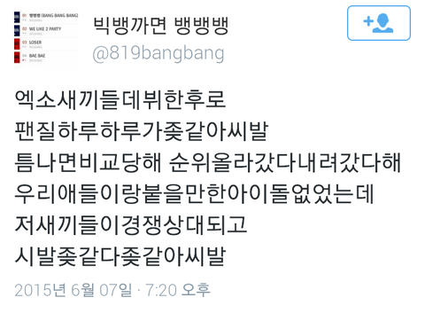 ㅋㅋㅋㅋㅋㅋㅋㅋㅋㅋㅋㅋ그렇게 잘나신 지네가수 일위유지못하고 우리애들이랑 경쟁상대되니까 열받나봄ㅎ