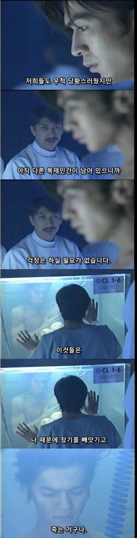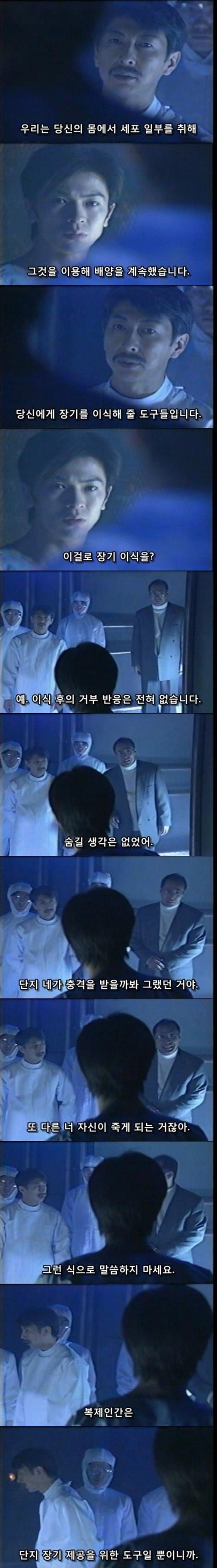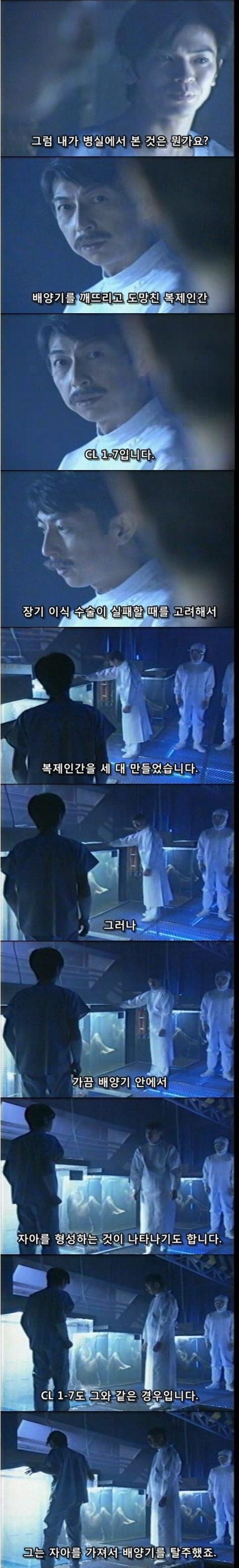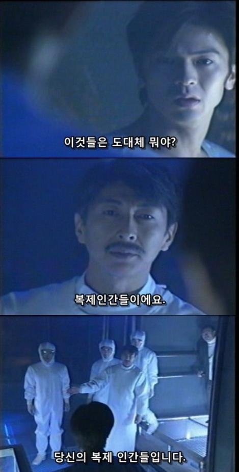 그럼 어제 봤던 복제인간은 뭐냐는 남주에 질문에, 수술이 실패할 경우를 대비하여 3면의 복제인간을 배양했는데 그중 한명이 배양기를 깨고 탈출하였고 그것이 가끔 발생하는 배양기안에서 스스로 인격을 형성시킨 복제인간이라 답하는 의사선생님.