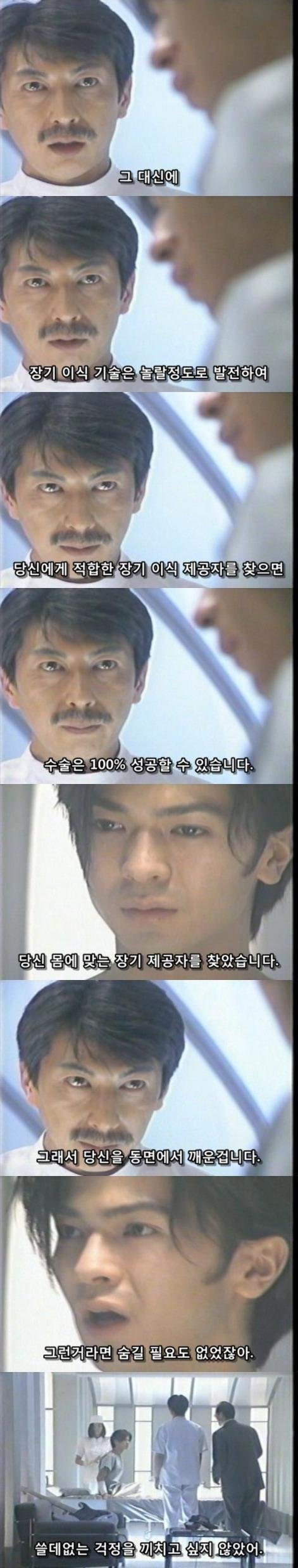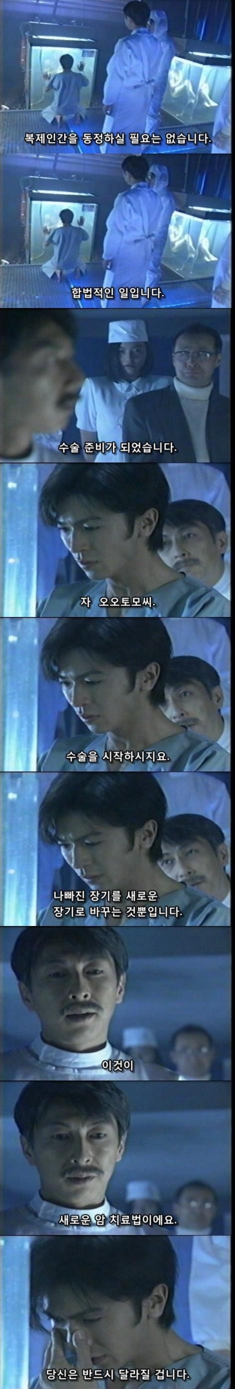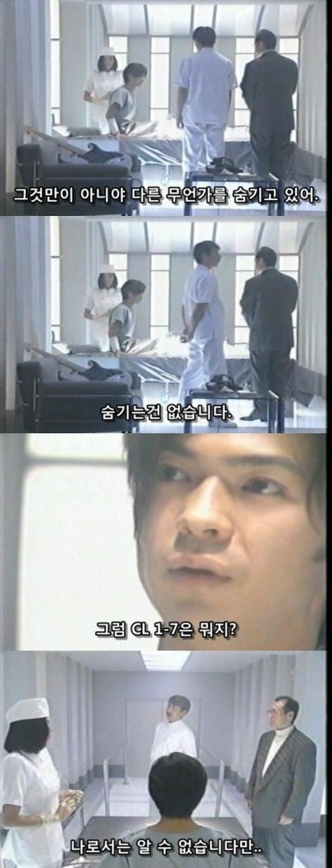 그럼 어제 봤던 복제인간은 뭐냐는 남주에 질문에, 수술이 실패할 경우를 대비하여 3면의 복제인간을 배양했는데 그중 한명이 배양기를 깨고 탈출하였고 그것이 가끔 발생하는 배양기안에서 스스로 인격을 형성시킨 복제인간이라 답하는 의사선생님.