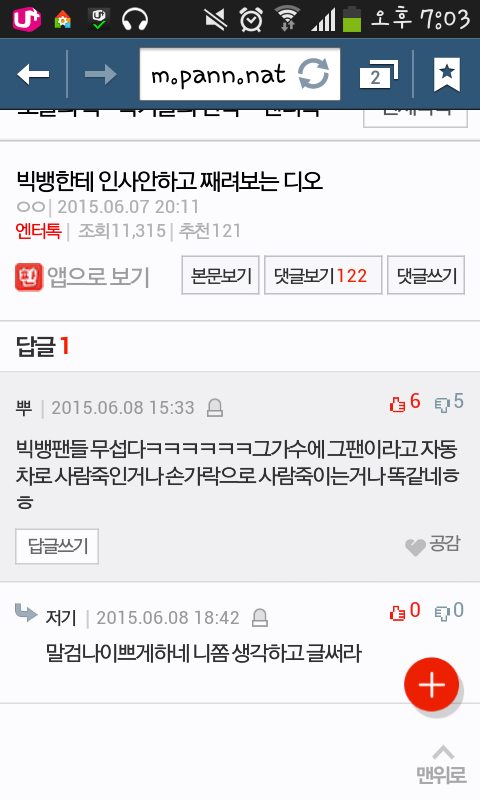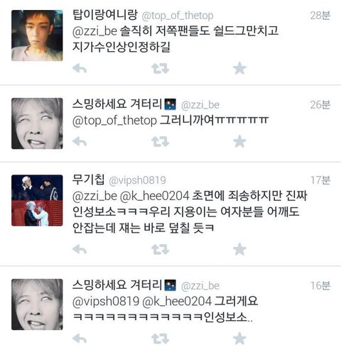 물론 빅뱅팬들도 같이 깟겟지 같이깟고 다똑같으니 싸우겟지만 인간적으로 이드립보고 소름돋았다 이렇게글쓴거보니깐 이사건아예모르고쓴 초딩인것같은데 제발그렇길바란다 특히 이글쓴얘야 과연 누가사람을 죽이고있는걸까 걍 웃겨서 별댓글안달고 쪼개면서 댓글보다가 멈칫..한사람한텐 영원한트라우마이고 사건직후에 울다가 기절까지하고 팬들도 한동안 대성이웃음못봐서 안쓰럽다가 이제조금씩 웃기시작했어 솔직히 마약드립 잘못은잘못이니 억울한점이없잖아있어도 난 걍 욕먹어도싸다고하고 거의넘어가는편이었는데 아직도 대성이는 너무 싸하고 아프네 잘못은 잘못이고 실수지만 그사람자체가 나쁜게아닌데 이렇게 남상처주고 자기오빠치켜세우는팬질이 그리좋을까 대성이는 아무리세월이지나도 면역이 안생기네