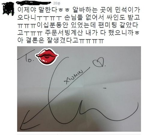 +싸인도 해주고 사진도 좀 여러장 뜨구~(매니저가 사진은 찍지 말라고 했다던데ㅠㅠ)혹시라도 걱정하는 웅녀들 있을까봐~후기 읽으니깐, 민석이 매니저랑 장난도 치고 고기도 많이 먹고 했대~