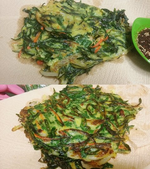 부추와 당근,땡초,조개살을 넣고 반죽해서 구운 부추전입니다!ㅎㅎ