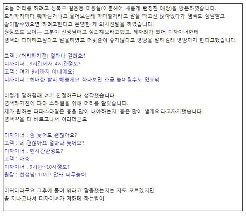 간략하게 말씀드리자면, 저는 파마와 염색을 동시에 하기로했고 머리해주시는분이랑 상의가 끝난상태였고 매장이 9시까지인데 10시정도에 끝날것같다고하였고, 제가 9시까지 아니냐고 물었습니다.