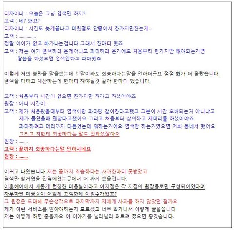 그래서 저는 거기서 불만을 표현했고 돌아오는 답변이라곤 자기들 영업시간이 9시까지고, 제 머릿결이 좋지 않다는 이유로 핑계만 늘어놓을뿐이였죠