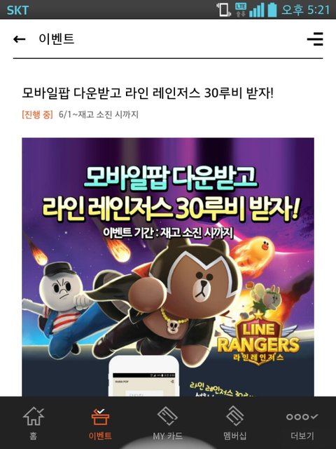 푹잼 빠진 라인레인저스 캐릭터들 짱귀엽네용~~루비 30개를 모바일팝카드 어플깔면 준데요..블로그 하다보니까 ㅋㅋ자주 쓰는 GS팝카드!! 어플까니까 완전 편한데 공짜 루비까지 대박 ㅋ라인레인저스 게임 즐겨하는분 필히 받자구용~~