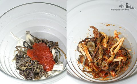 7 삶은 고사리와 느타리버섯은 간이 잘베도록,다대기를 넣고 버무려놓는다