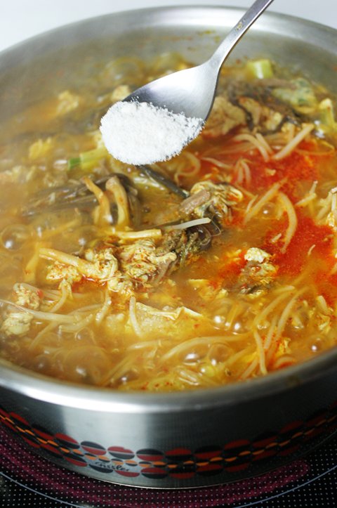마지막 숙주를 올리고 5분끓인뒤 계란과 섞어둔 대파를 올리고 10분 더 끓이면 완성