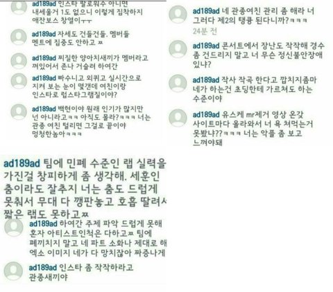 진짜 나 샤월인데 딥빡ㅋㅋㅋㅋㅋㅋㅋㅋㅋㅋㅋㅋㅋㅋㅋ쳐죽일년이네 저거 진짜 왜 착한애한테 지랄이얔ㅋㅋㅋㅋㅋㅋㅋㅋㅋㅋ찬열이가 보살이네 저렇게 심하게 욕먹고도 저렇게 말해주다니.. 진짜 저 악플들을 봤다는 사실이 마음아프다. 연예인은 감정도 없고 사람도 아닌가? 왜 인스타 와서 테러질;;
