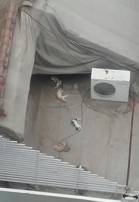이제 아기들이 제법 커져서 젖을 떼고 사료를 먹어야 할 시기인데. 옥상에서 건너건너 내려오기가 아직 위험하고 어려서 그런지 늘 이 위에서만 있습니다.