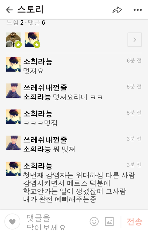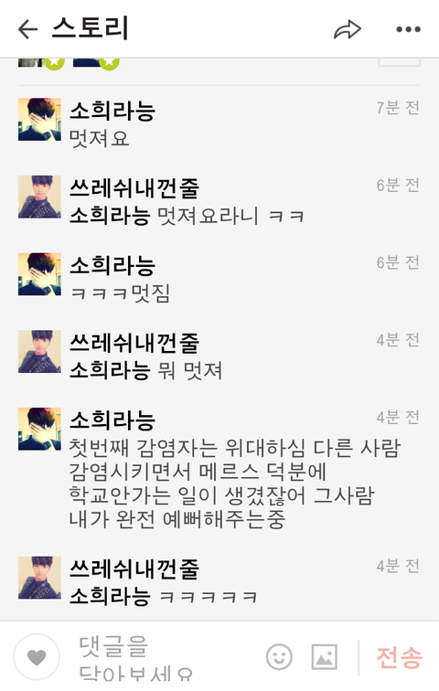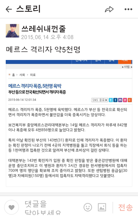 지금 어이가없어서 띄어쓰기랑 맞춤법틀려도 양해해줘 오랜만에 카카오스토리구경하다가 카친이 메르스글을올렸길래 보고댓글을봤거든?근데어떤모르는 중1여자애가 저런식으로 댓글을달아놨더라고 이거또라이아니야?지금메르스때문에 돌아가신분들이 얼마나많고 힘들게메르스앓고계신분글이 얼마나많은데저딴말을할수가있어?