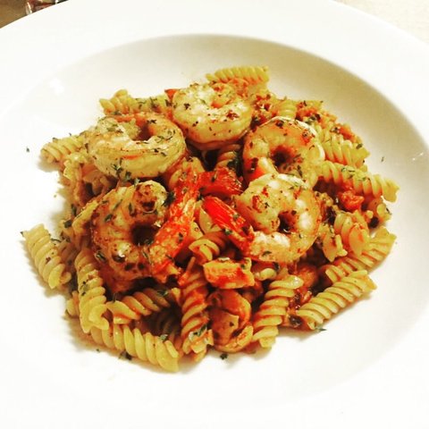 새우버터구이와 닭가슴살경단을 찹을 해서 만든 푸실리