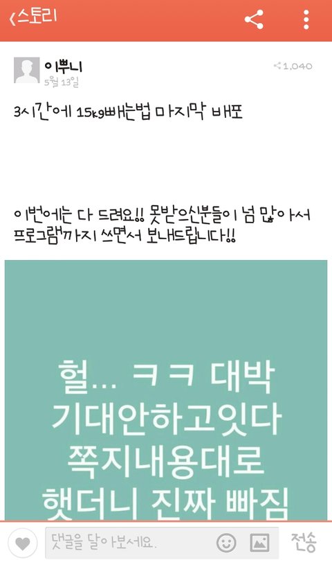 이거 한때 진짜 많이 보이지 않았어? 그래놓고 오는건 별로없어ㅋㅋㅋ 그거 따라하면 3시간에 15kg는 무슨 2kg도 안빠지더라.그리고 하루에 15kg가 빠진다는게 말이 안되는것같아. 제발 이런 글좀 그만 올려줬으면