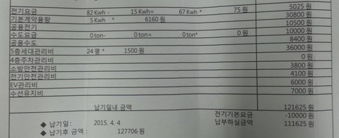3. 그 외 공용전기랑 공용수도가 매달 조금씩 다르지만 대략 각각 만원정도 이다. 우리 층은 공용수도를 쓸 일이 없고, 1층은 상가라 화장실이 있어 공용수도는 많이 쓰지만 엘레베이터 사용을 하지 않으니 공용전기를 쓸 일이 적다. 그래서 그냥 따지지 않고 전기 수도를 모든 층에서 똑같이 나눠 내기로 하였다.