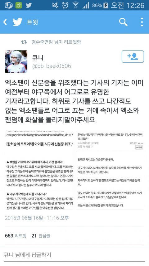 기자가 문제면 거기에 대한 반박을 찾아야지 트위터에서 지 팬들이 당연히 좋게좋게 씨부린 소리를 캡쳐해서 증거랍시고 내밀고 다니면서 엑소팬 욕하지 말라고 하면 대체 어떻게 받아들여야 됨?