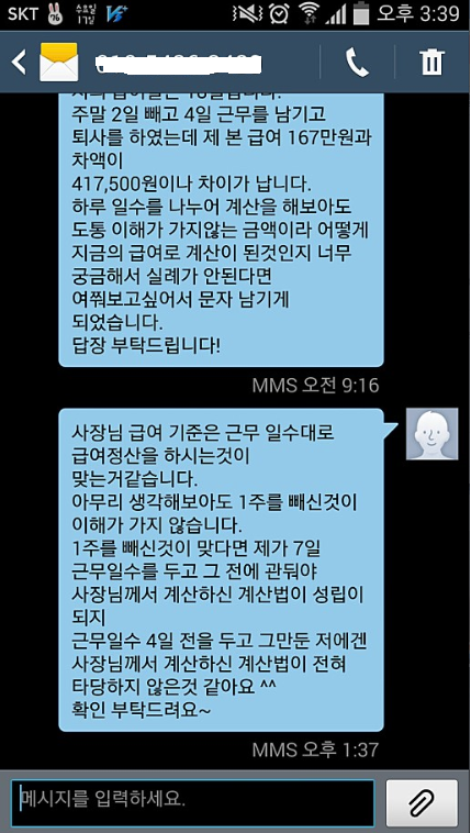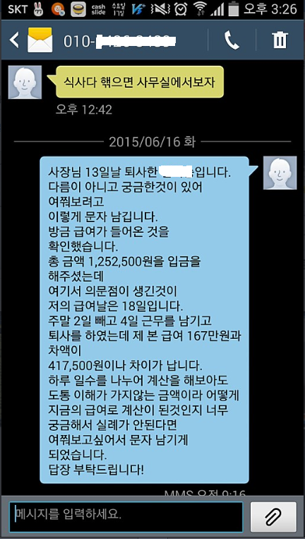 제가 보낸 문자를 방금 보셨다고 하셔서 문자로 보내드린 급여정산에 대한 부분을 직접 여쭤보았습니다.