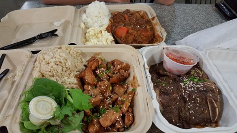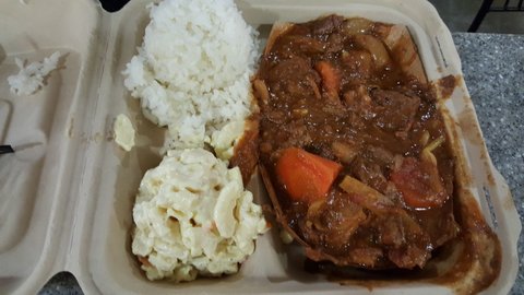 Plate음식을 시키면 종업원이 물어보는데요 브라운 라이스 냐 하얀 밥이냐 저는 건강을 위하여 브라운 라이스 맥샐러드 먹을거야 야채 샐러드 먹을거야 저는 한쪽에는 야채 한쪽에는 맥 샐러드 맥샐러드는 하와이 로컬 샐러드에요
