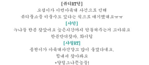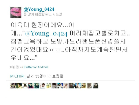 2) 바나를 필두로 한 다수의 팬덤들은 강간예고 트윗을 본 후 사실확인따위 하지않고 무조건 리트윗 (퍼나르기) 하기 바빴고 결국 트윗이 SNS 도처에 퍼진 후 아육대의 녹화일이 되었다. 강간예고 트윗이 맞게 아육대 녹화내내 상당한 증거가 (증거라고 쓰고 루머라고 읽는다) 쏟아졌고 팬덤들은 역시 사실확인 여부는 중요하지 않고 무조건 리트윗 & 리트윗.... 사실이든 아니든 퍼날라서 달샤벳이랑 달링 욕하고보자!!