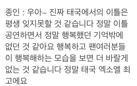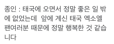수고했어 종인아 태국에서 행복하고 즐거운 추억들로 가득하길 바래 종인이가 행복하면 나도 행복하고 즐거워 조심해서 돌아와 보고시퍼
