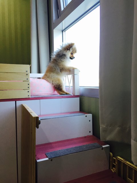 (+추가) 댓글중에 계단 높이가 높아보인다고 하셔서요 ㅎㅎ 네 맞습니다 맞춤제작이 아니고 기성사이즈로 나오는 선반들을 이용해 만들다 보니 아무래도 창문까지의 높이도 높은데 계단 수는 많고 경사가 좀 심해서 나중에 좀더 보수 할수 있으면 하려는 생각도 있어요 ㅎㅎ 계단 하나하나의 높이는 보통 애견 계단들을 참고해서 그 높이 안에서 만들어서 높지는 않은데 넓이가 넓지않아 경사진 감이 있더라구요, 그래서 발이 미끄러울까봐 미끄럼방지 카펫도 붙여주었는데 처음엔 좀 경사져서 조심하더라구요~ 근데 지금은 시월이가 몸도 많이 커서 두칸씩 내려오고ㅎㅎ 걱정돼서 계단밑에 푹신한 쿠션을 두었는데 그위로 네칸을 점프해 버리더라구요.. 높아서 못올라가는것보다는 2초만에 올라가고 1초만에 뛰어내려 버려서 심장 철렁하게 만드는게 더 걱정입니다.... ㅠㅠ 포메가 다리가 약해서 뛰지 못하게 교육시키는데 계단은 조금 보수 해주어야겠어요 ㅎㅎㅎ 감사합니다