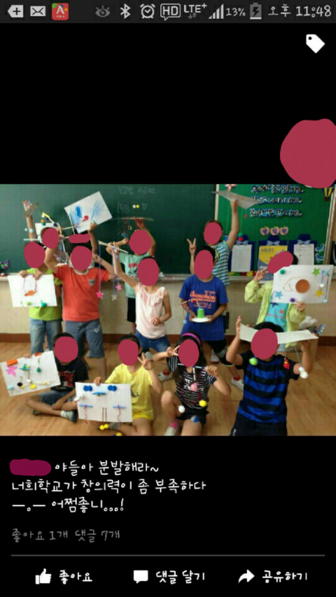 아이들이 열심히 만든 미술작품을 선생님이라는 사람이 페이스북에 안 좋은 글과 함께 올리는게 과연 본인 직업에 자질이 있는지 참.. 씁쓸하네요..