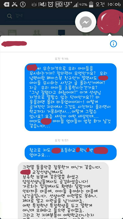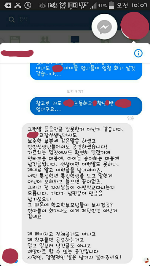 그 학교 다른 학년의 어머니 한 분이 그 글을 보게 되었고, 글에 대해 지적을 했습니다.