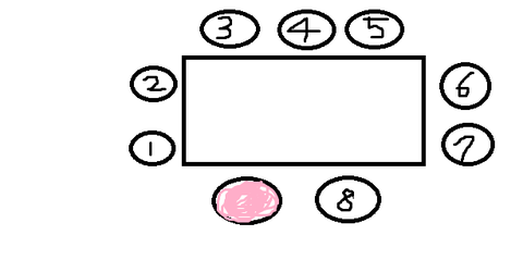 1번이 가장 좋은 자리임. 심리학적으로 남녀가 서로에게 부담없이 대화하며 호감을 느낄수 있는 자리도 저 자리고. 8번은 오히려 부담이 될수도 있고, 옆을 바라보며 말걸기도 어려움. 바로 맞은편은 편한사이가 아닌이상 오히려 어색함을 유발할수도 있고. 서로에게 보여지는 얼굴의 각도상으로도 1번이 좀더 매력적이게 보여질수있음.