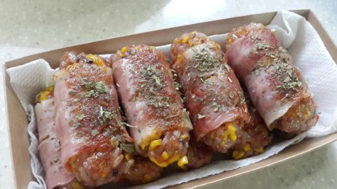베이컨밥말이. 이건 피크닉 음식으로도 제격이예요. 베이컨 안에 밥을 넣고 말아서 한번 구워야 하는 음식이기 때문에, 이 안에 들어간 밥도 쌀+찹쌀로 지었습니다. 그냥 먹어도 맛있고, 머스타드 살짝 발라 드셔도 맛있어요 ^^